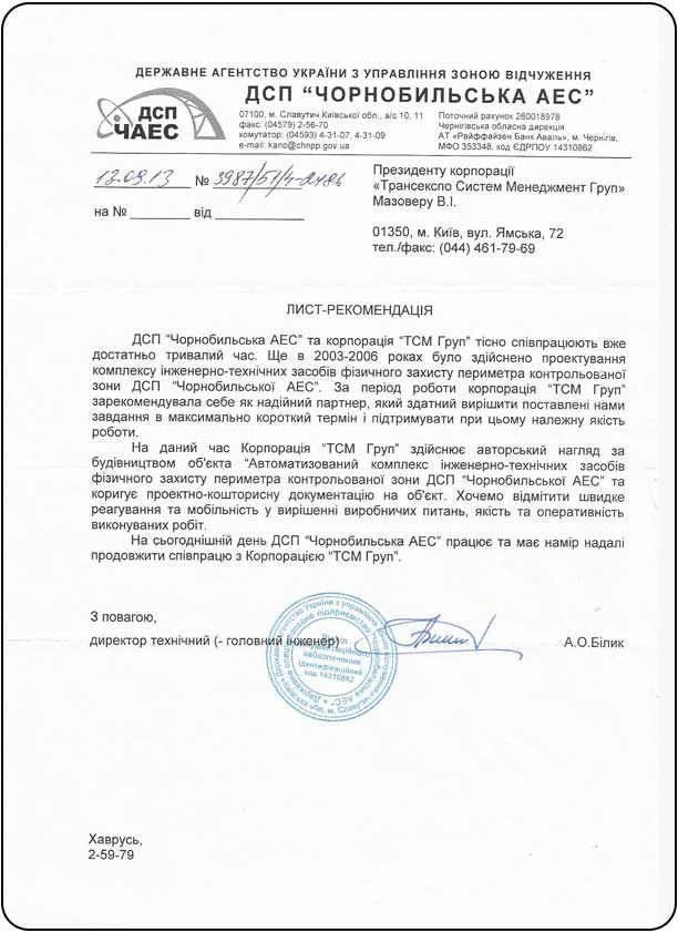 SSE "CHERNOBYL NPP" and "TSM GROUP" Corporation has been cooperating closely for a long time. Complex of technical and engineering devices for physical security of perimeter of controlled area of SSE "CHERNOBYL NPP" in 2003-2006 were designed. During the period of cooperation, "TSM GROUP" Corporation has established itself as a reliable partner, which is able to perform our tasks as soon as possible and with best quality.