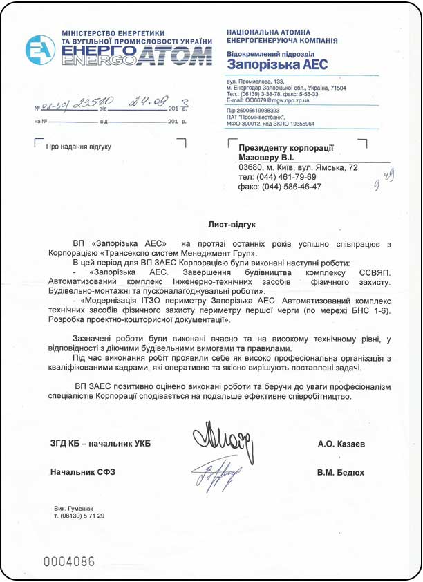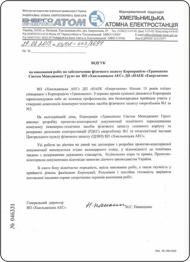Separated unit "Khmelnitsky NPP" of State Enterprise "National Nuclear Energy Generating Company "Energoatom", productively cooperates with "TSM GROUP" Corporation for more than 15 years. From first steps of our joint activities, "TSM GROUP" Corporation recommended itself as a team of professionals, which directly took part in establishing of complex of technical and engineering devices for physical security of power units #1 and #2.