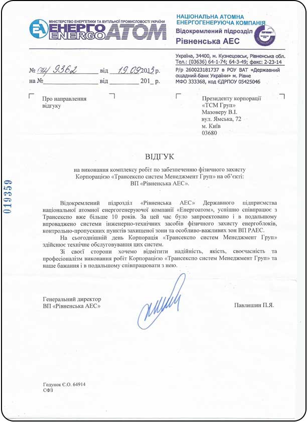 Separated unit "Rivne NPP" of State Enterprise "National Nuclear Energy Generating Company "Energoatom", successfully cooperates with "TSM GROUP" Corporation for more than 10 years. Systems of engineering and technical devices of physical protection of power units, as well as access control points to secure and highly sensitive zones of NPP, were designed and implemented during this time.